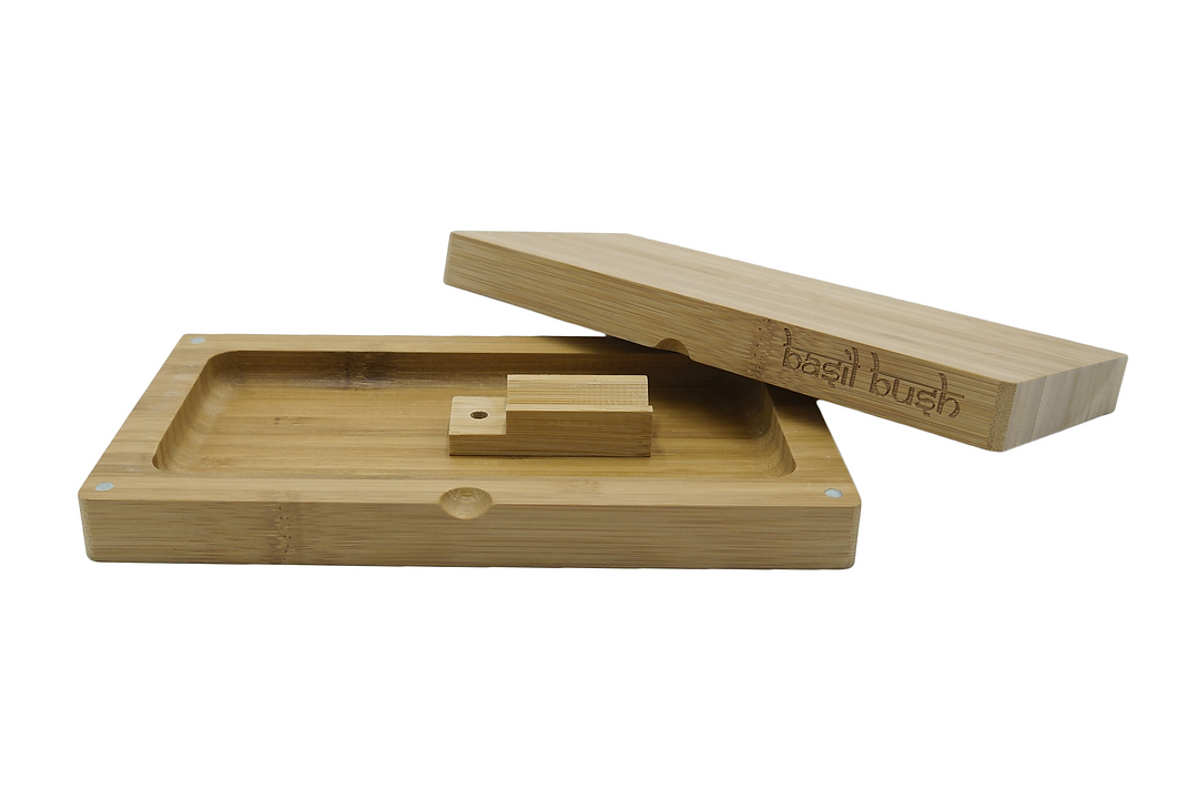 SKU BBTRAY2 Natural bamboo, magnetic two part rolling tray, with built in rolling 'V'. (22cm x 12cm x 4cm)